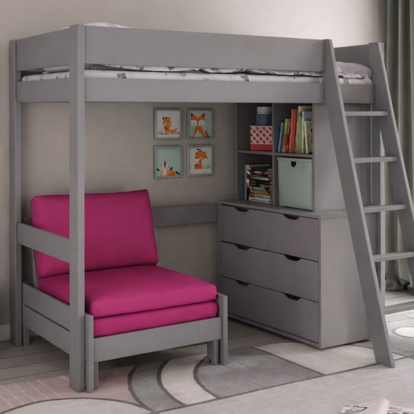 The chest of drawers tucked beneath the loft bed is a compact, space-saving piece designed with both function and simplicity in mind. Finished in a soft, matte gray, it blends seamlessly with the bed frame, creating a cohesive and modern look. The unit features multiple smooth-front drawers with subtle cut-out handles, giving it a clean, minimalist appearance while still being easy to use. Also available in white. Freestanding so doesn't have to go under the bed.