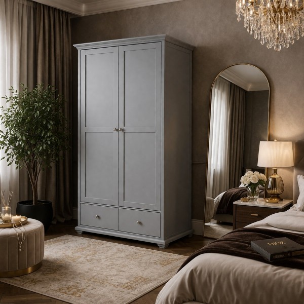 The sturdy and handsome Parisot Margaux two door wardrobe, with the additional benefit of two drawers, is a good looking and effective storage solution for your clothes. The Pebble Gray finish is bright and clean and will blend with any décor. Behind the doors are a single width full length hanging space, a double width shelf across the upper part of the interior and two roomy single width shelves. Stylish and practical team it with other products in the Margaux range to give your room a coordinated look.