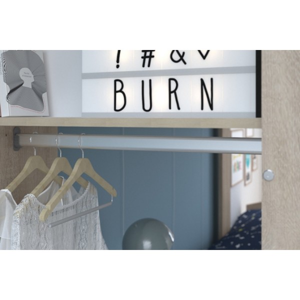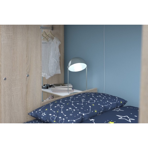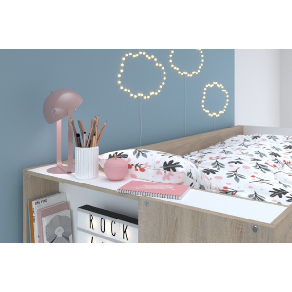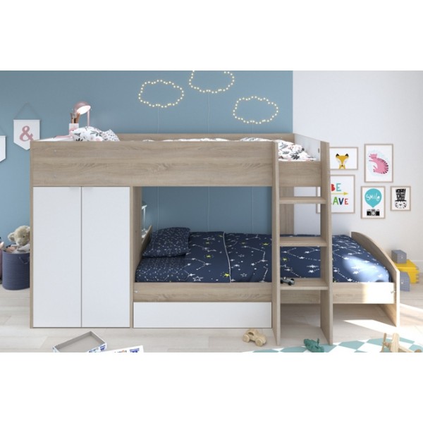 Looking for inspiration then look no further with this funky Parisot Stim bunk bed, which is a highly desirable bed for youngsters and parents alike. The beds are off set as opposed to directly in line one above the other, with a cupboard and desk at one gable end acting as support, storage and a space to play or work. There is also a spacious storage drawer underneath the bed providing even more space to tidy away game, toys, clothes or bedding.The lovely oak wood effect and white finish will compliment any decor.