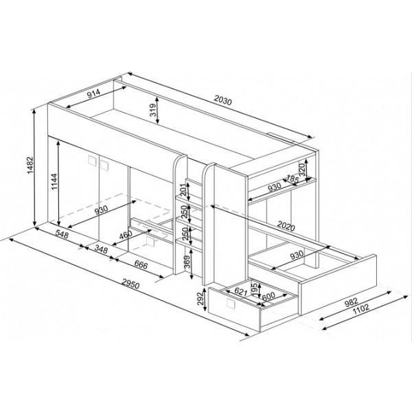 The Barca features: Comfortable upper and lower sleeping areas Built-in wardrobe with hanging space Integrated drawers for clothes, toys or bedding Open shelving for books, décor or essentials